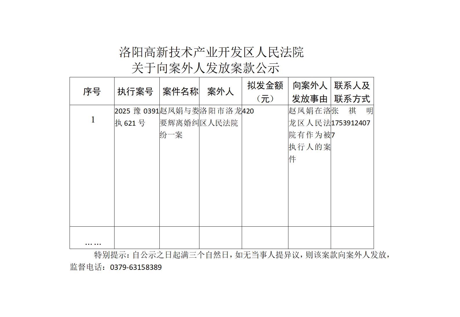 洛阳高新技术产业开发区人民法院关于案外人发放案款案件的公示