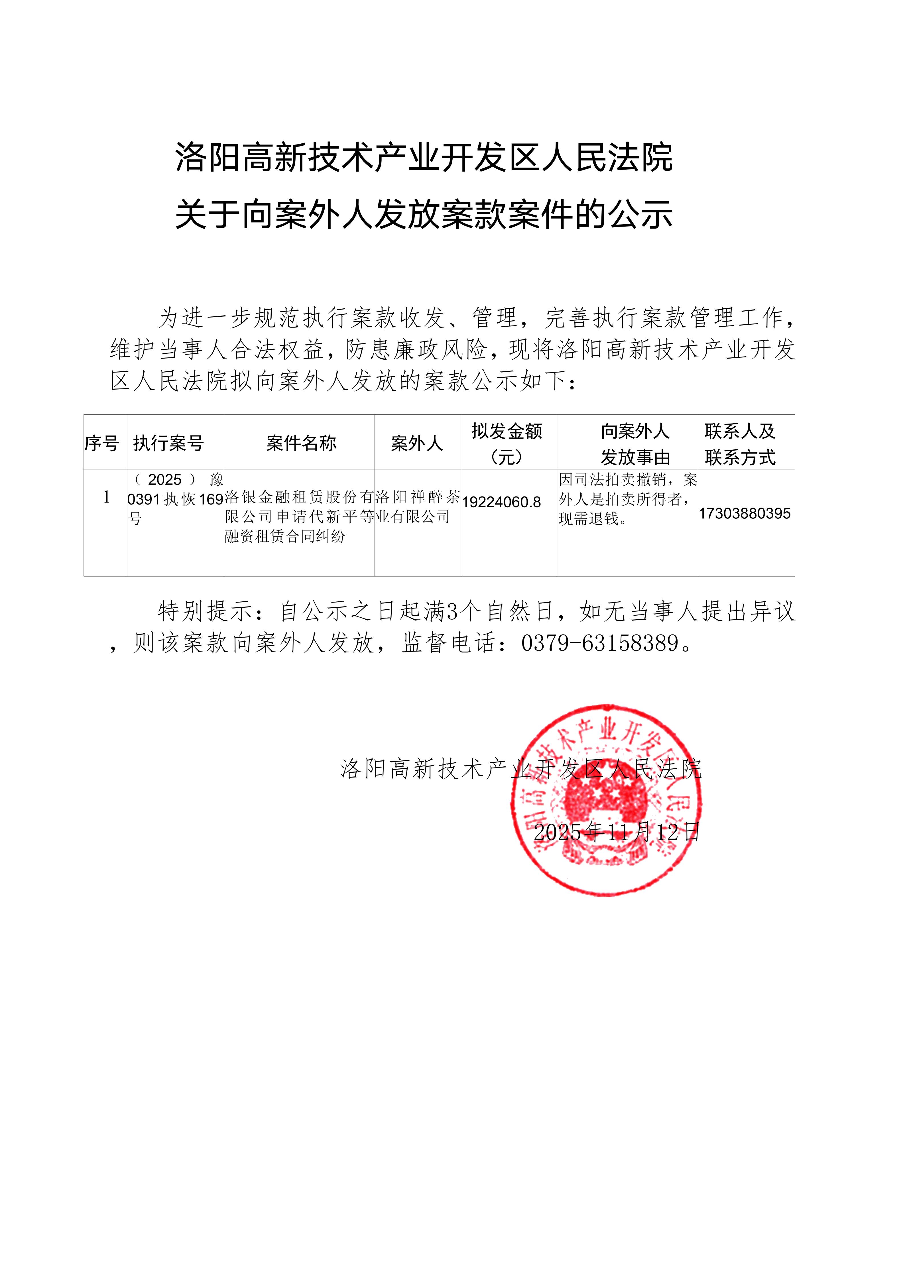 洛阳高新技术产业开发区人民法院关于案外人发放案款案件的公示