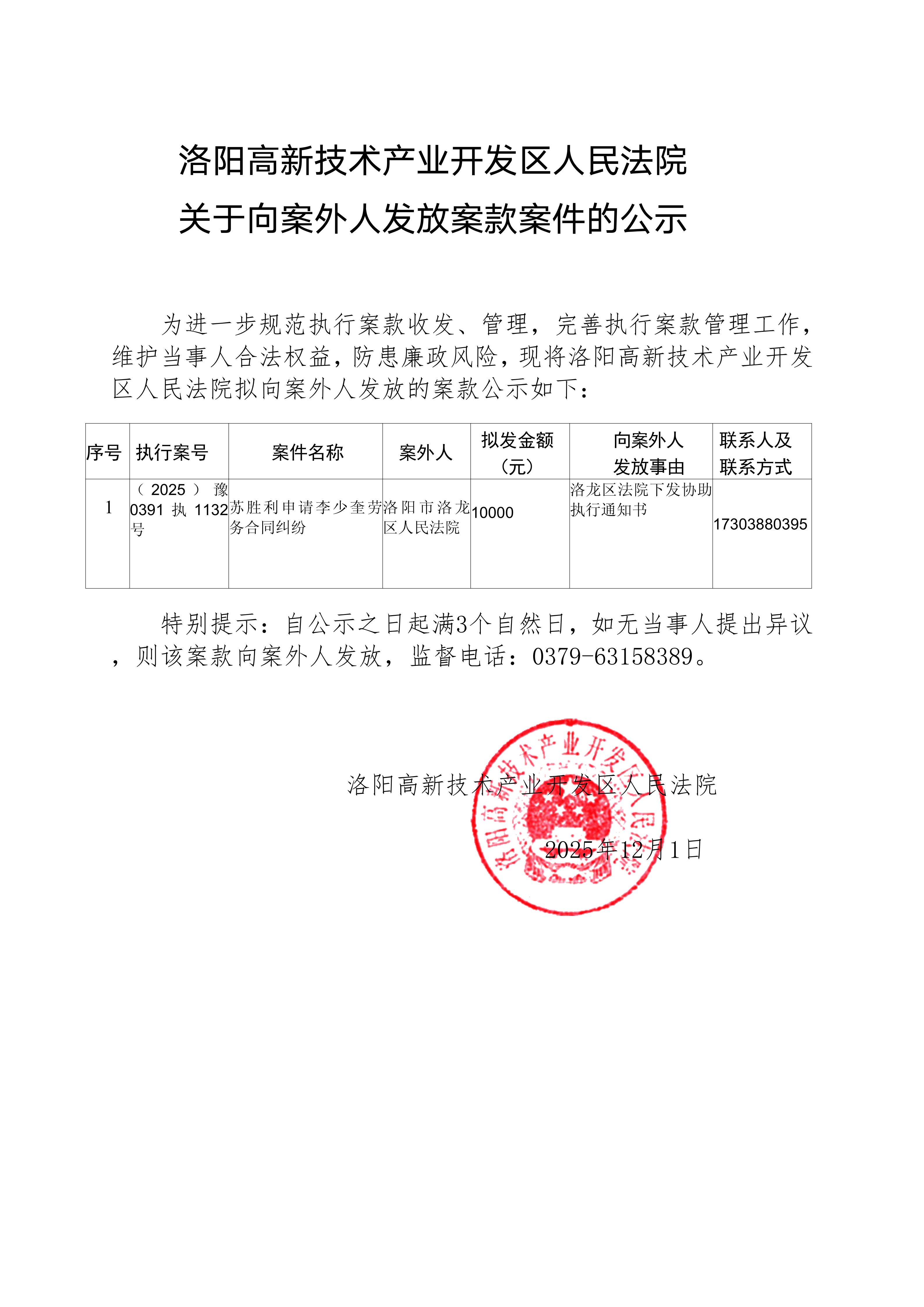洛阳高新技术产业开发区人民法院 关于向案外人发放案款案件的公示