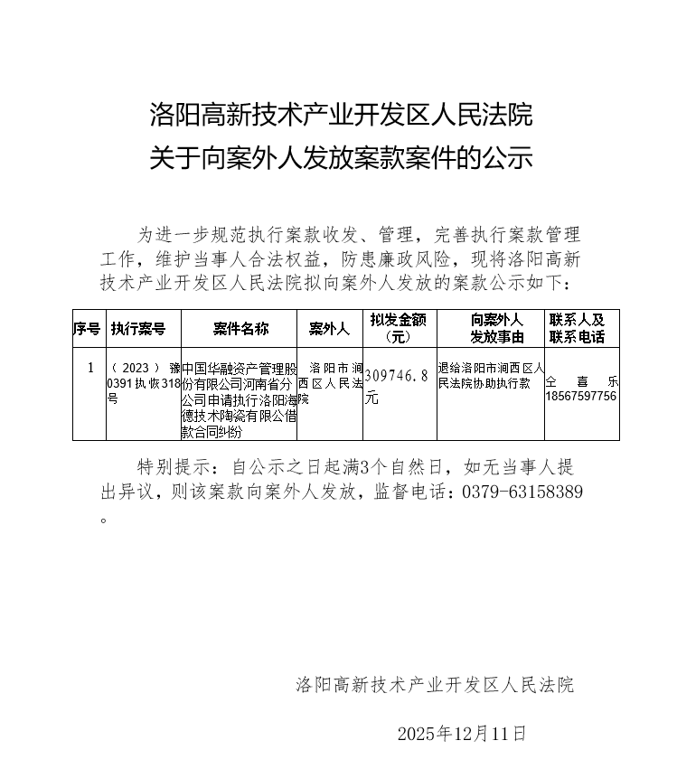 洛阳高新技术产业开发区人民法院 关于向案外人发放案款案件的公示