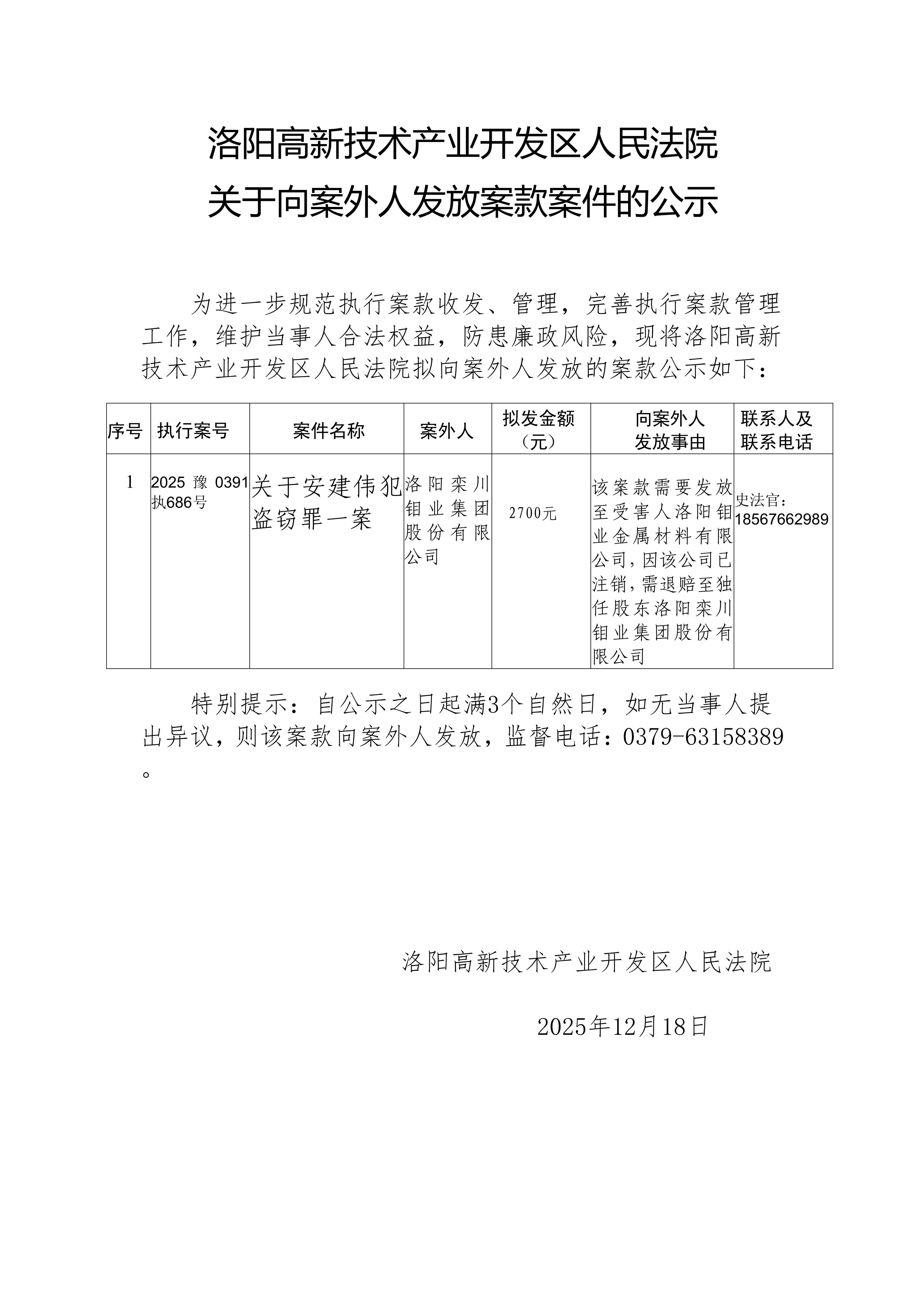 洛阳高新技术产业开发区人民法院 关于向案外人发放案款案件的公示