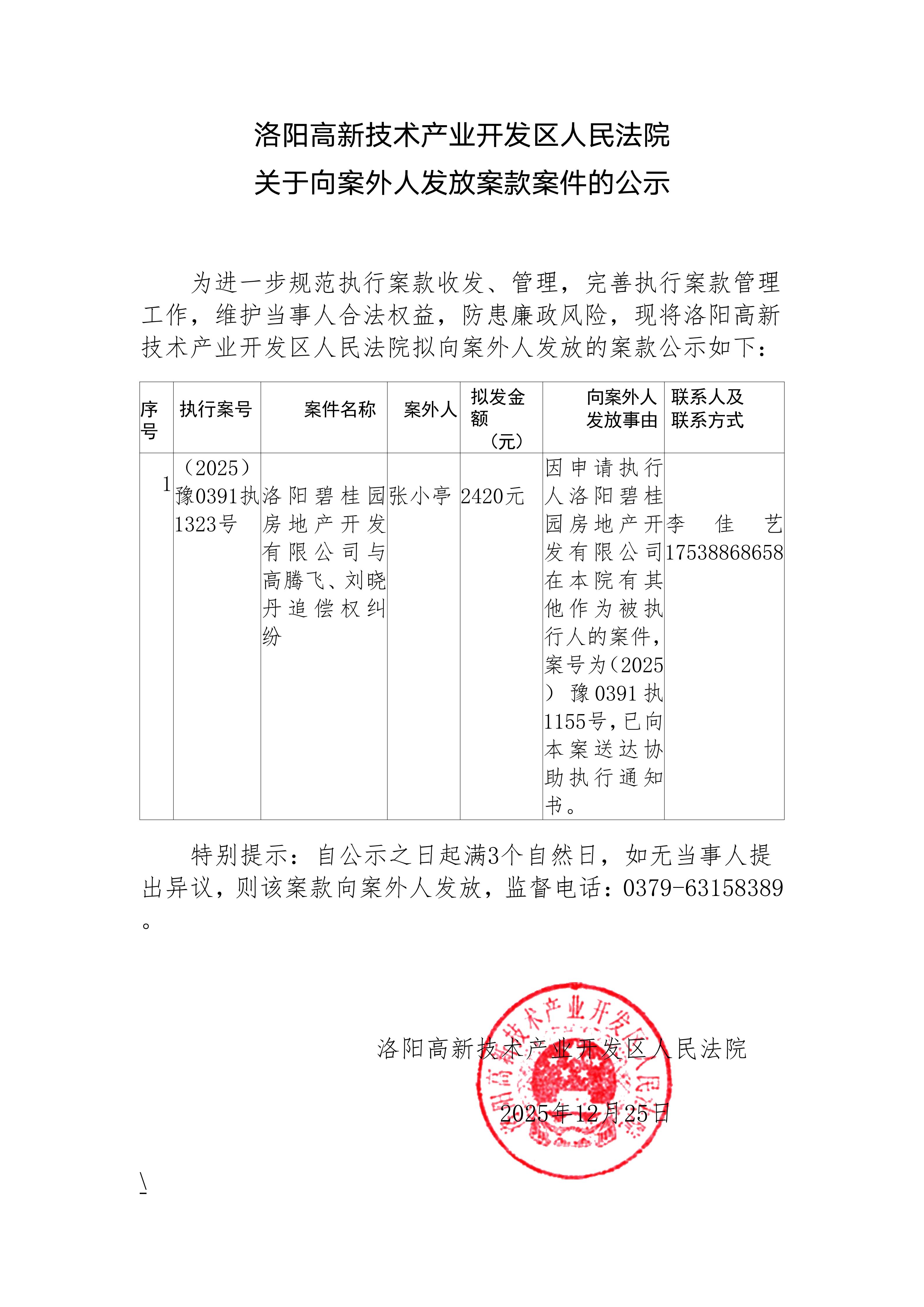 洛阳高新技术产业开发区人民法院 关于向案外人发放案款案件的公示