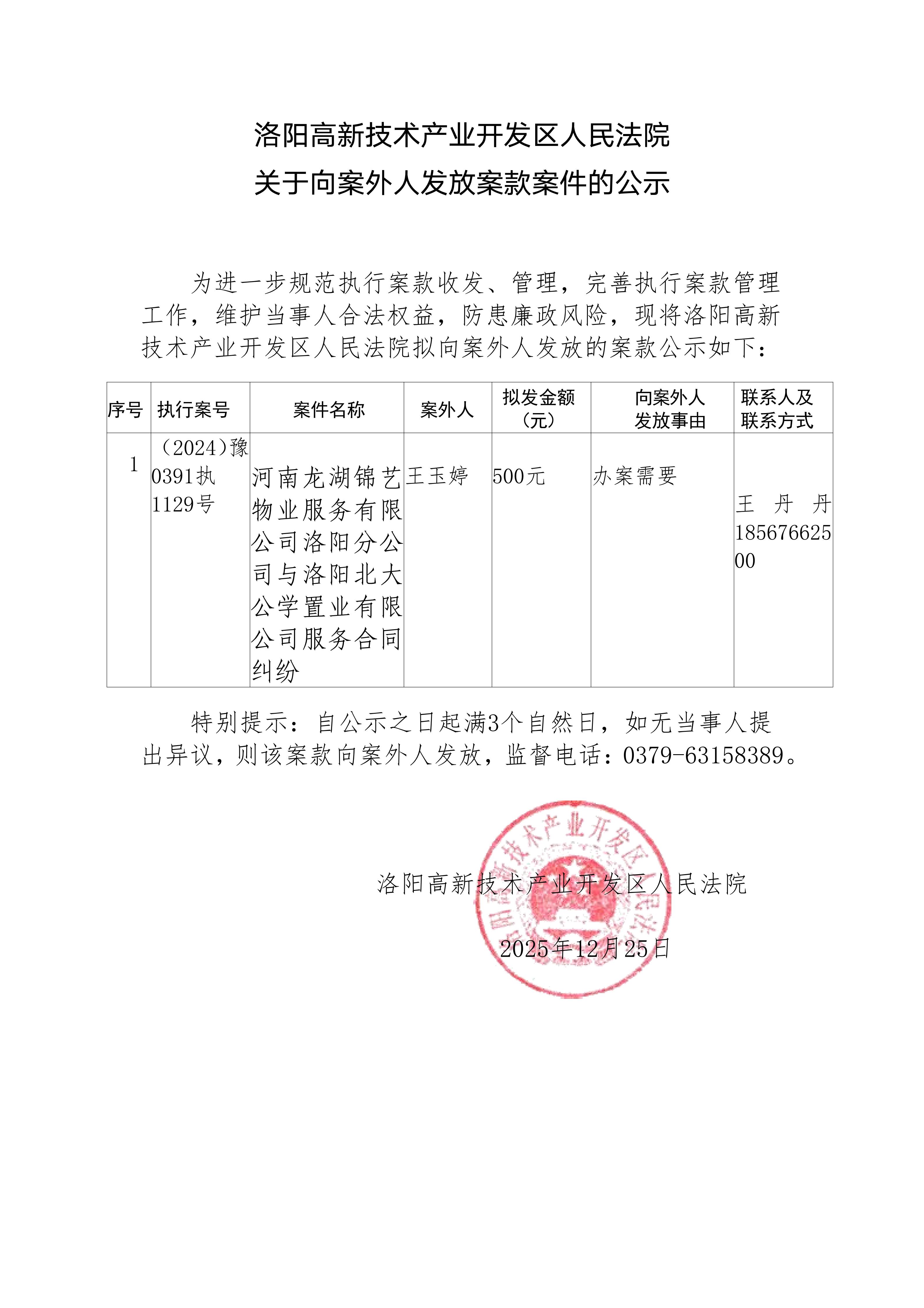 洛阳高新技术产业开发区人民法院 关于向案外人发放案款案件的公示