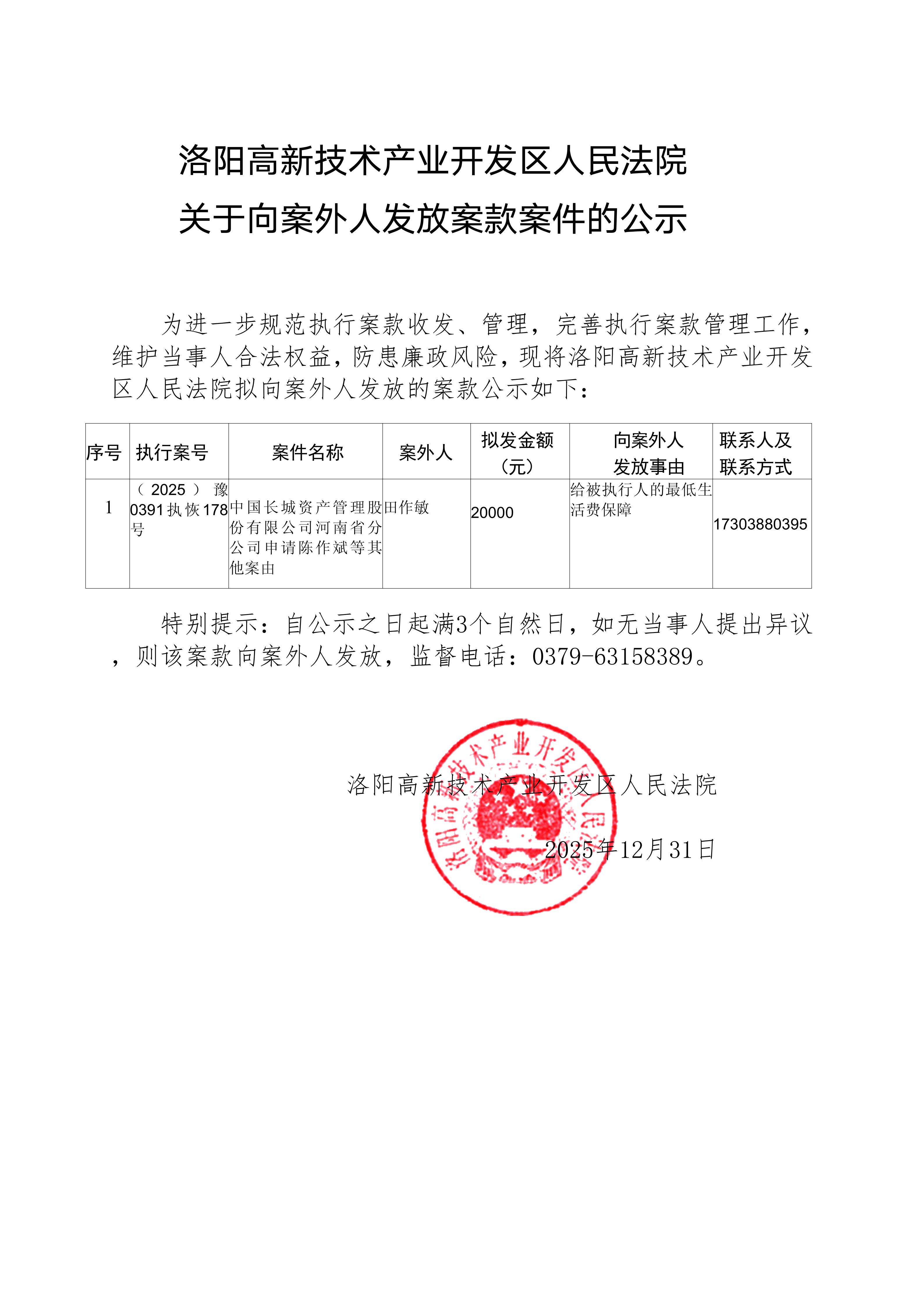 洛阳高新技术产业开发区人民法院 关于向案外人发放案款案件的公示