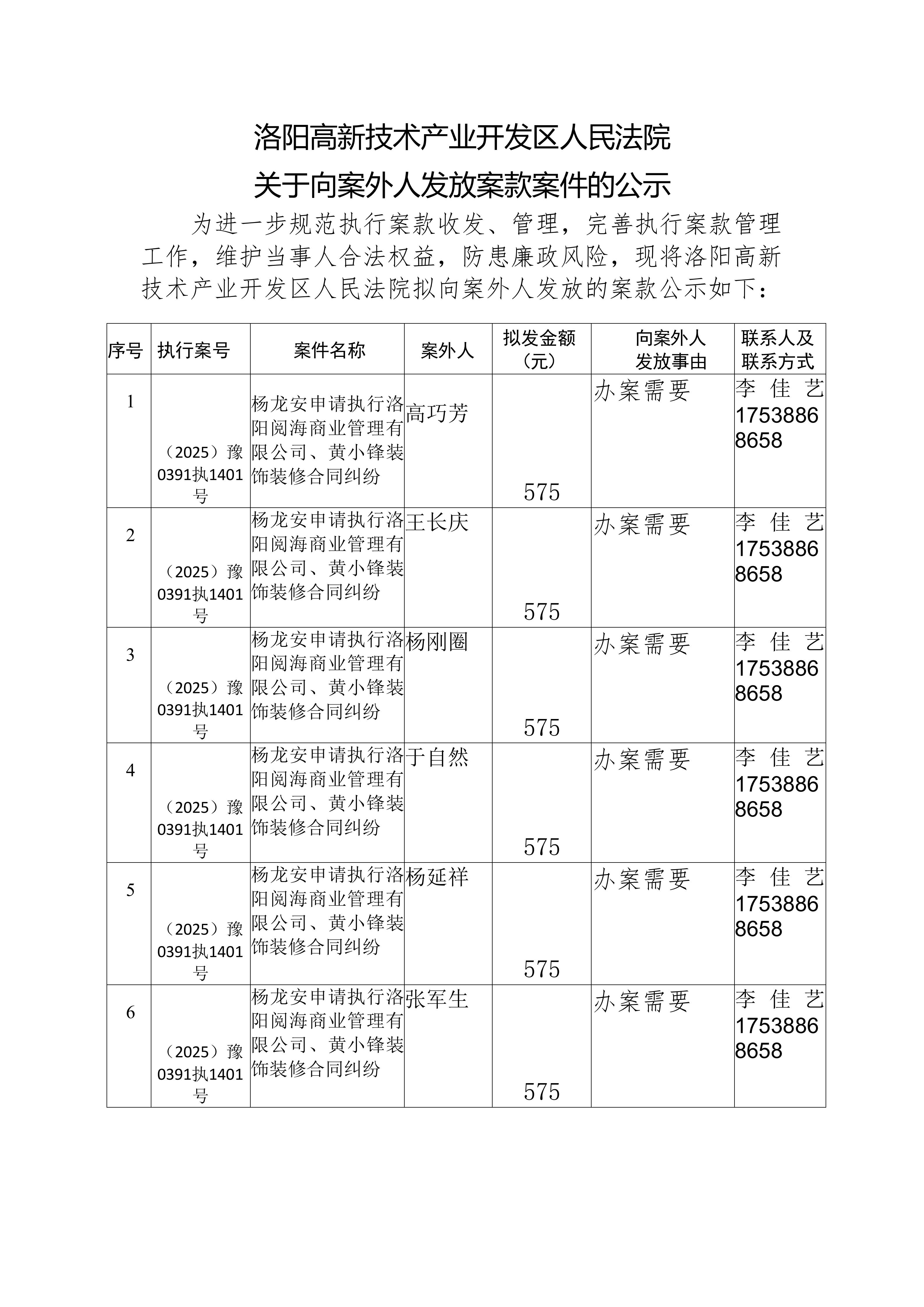 洛阳高新技术产业开发区人民法院 关于向案外人发放案款案件的公示