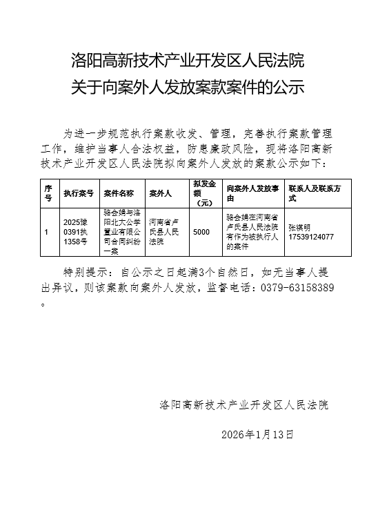 洛阳高新技术产业开发区人民法院 关于向案外人发放案款案件的公示
