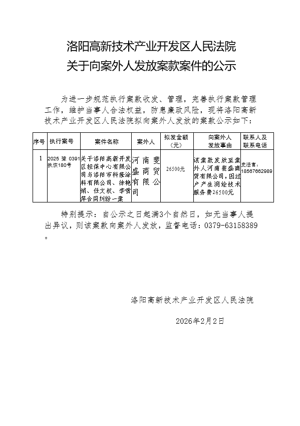 洛阳高新技术产业开发区人民法院 关于向案外人发放案款案件的公示