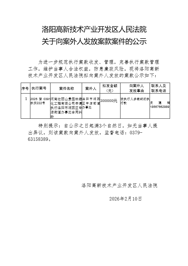 洛阳高新技术产业开发区人民法院 关于向案外人发放案款案件的公示