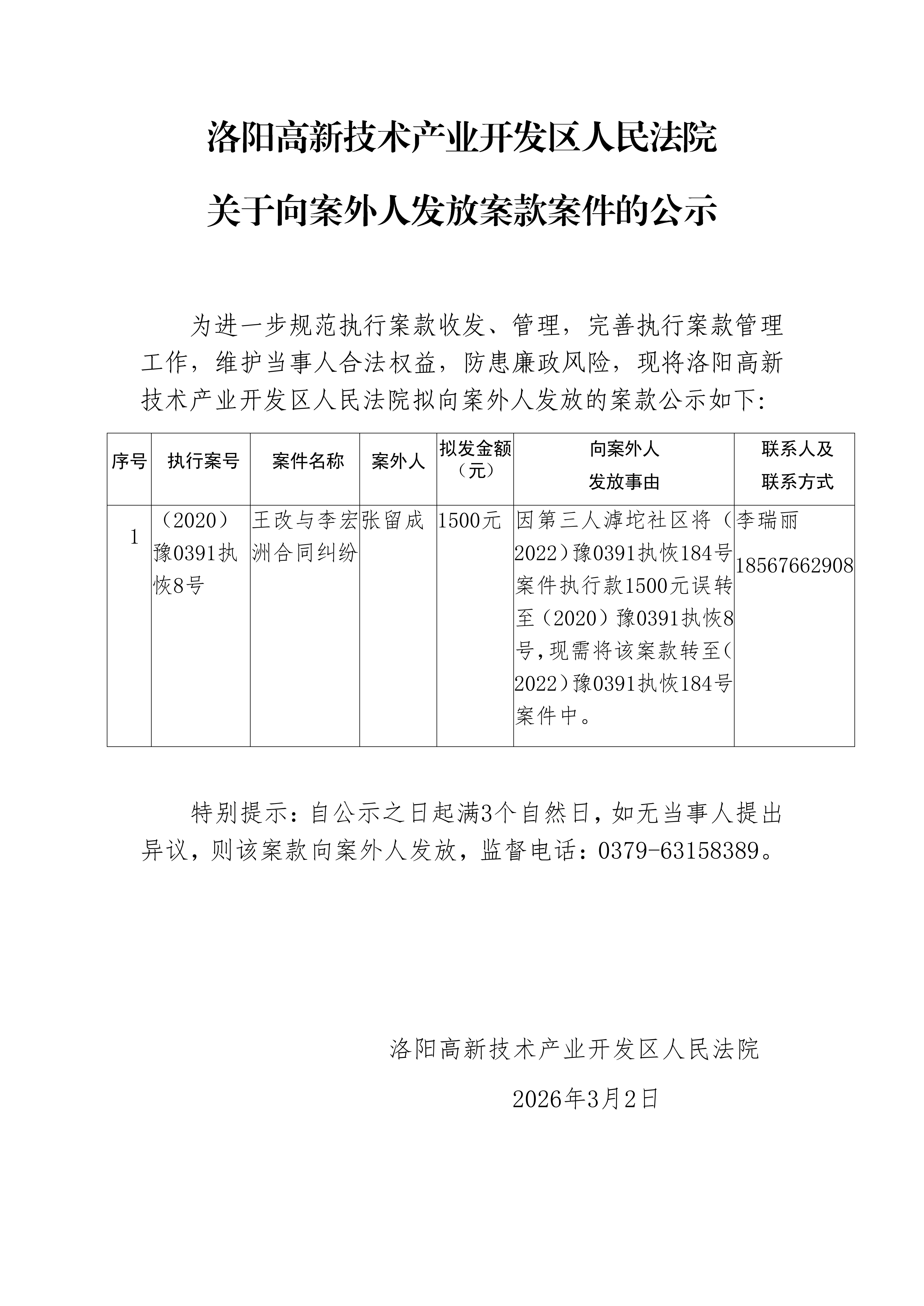 洛阳高新技术产业开发区人民法院 关于向案外人发放案款案件的公示