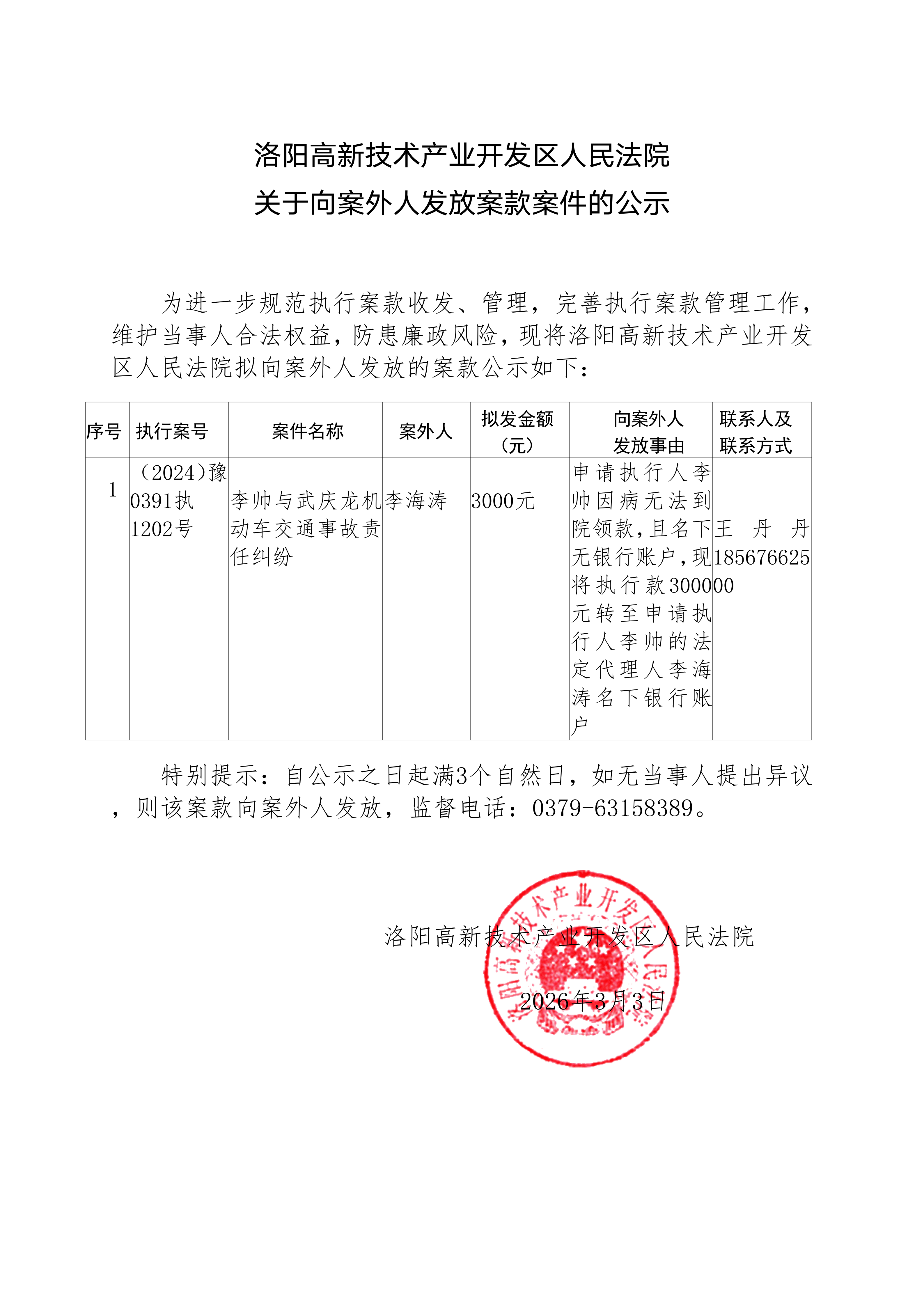 洛阳高新技术产业开发区人民法院 关于向案外人发放案款案件的公示