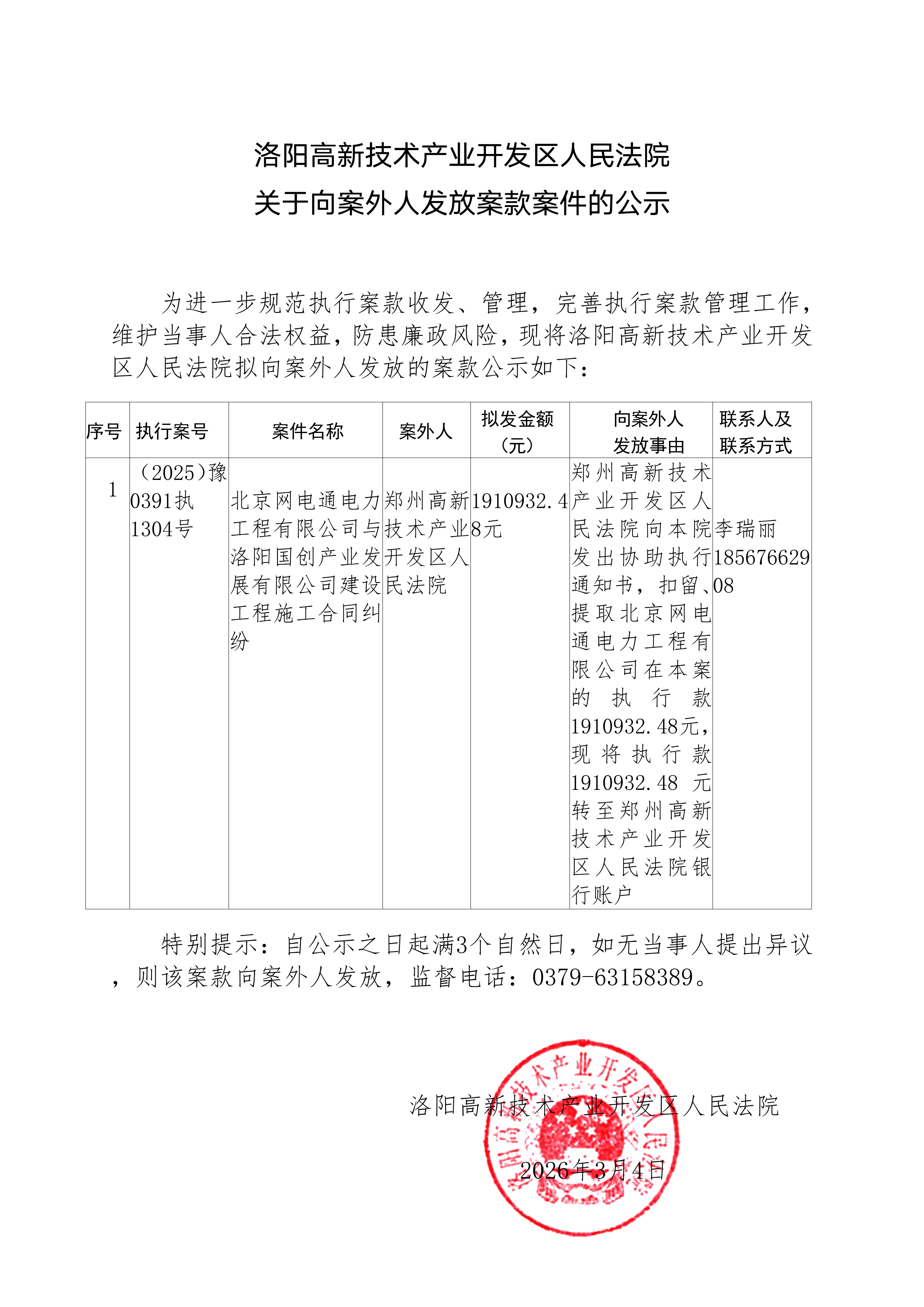 洛阳高新技术产业开发区人民法院 关于向案外人发放案款案件的公示