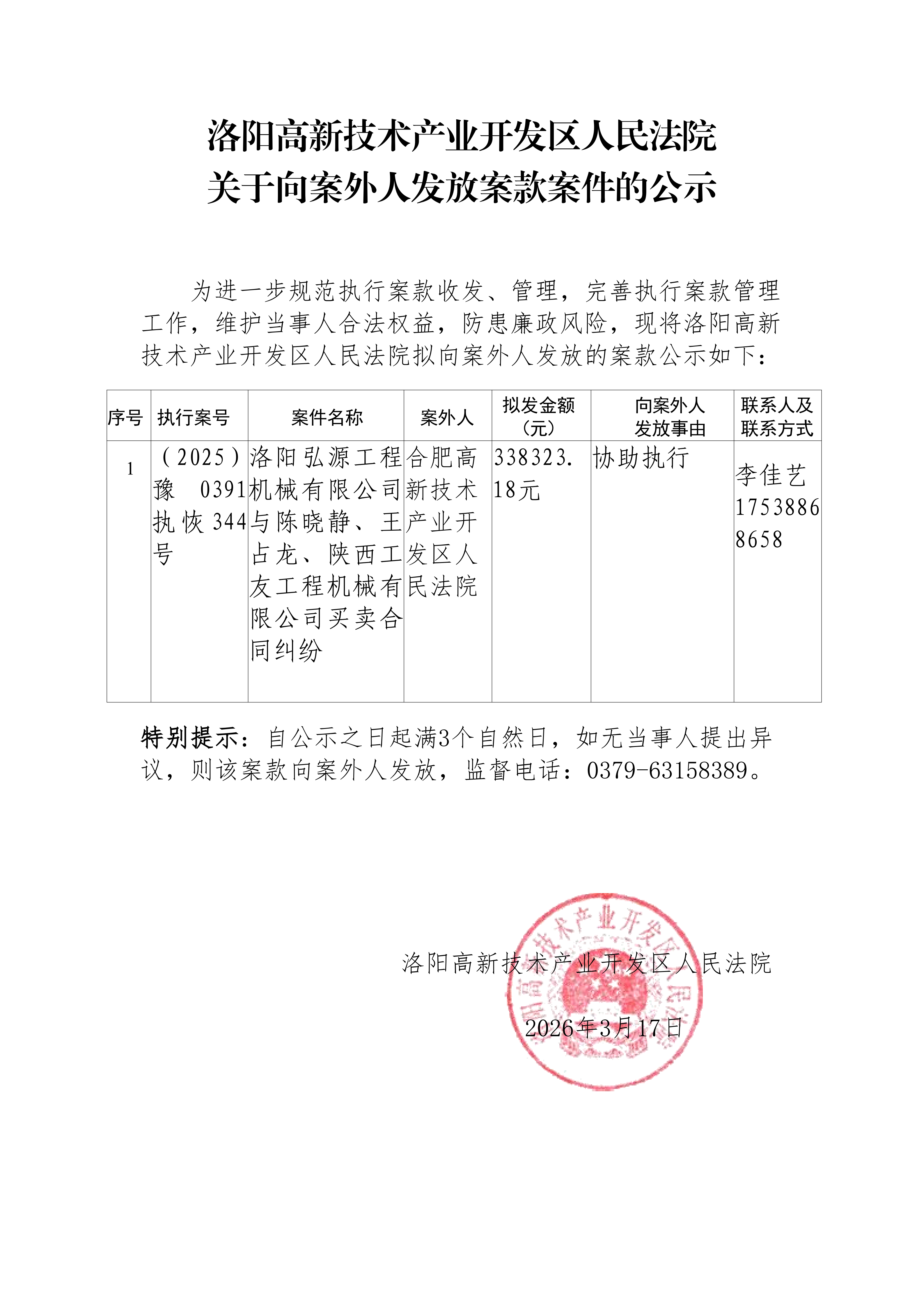 洛高新技术产业开发区人民法院 关于向案外人发放案款案件的公示