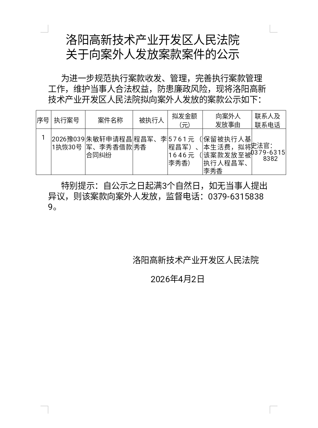洛阳高新技术产业开发区人民法院 关于向案外人发放案款案件的公示